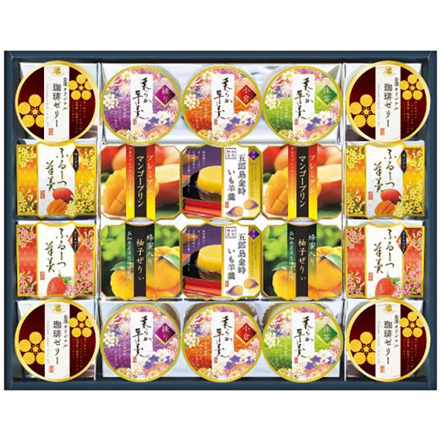 ■規格:五郎島金時いも羊羹80g・プレミアムマンゴープリン75g・蜂蜜入り柚子ぜりぃ75g各2個・金澤オリジナル珈琲ゼリー52g×4個・柔らか羊羹60g(抹茶・小倉・練り)・ふるーつ羊羹60g(ストロベリー・マンゴー)各2個