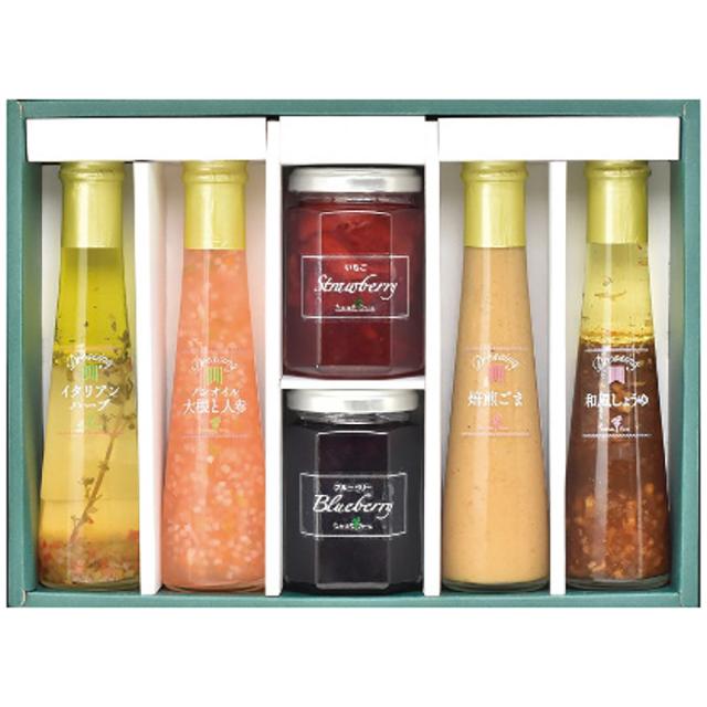 ■規格:ジャム145g(いちご・ブルーベリー各1個)・ドレッシング122ml(イタリアンハーブ・ノンオイル大根と人参・焙煎ごま・和風しょうゆ各1本)