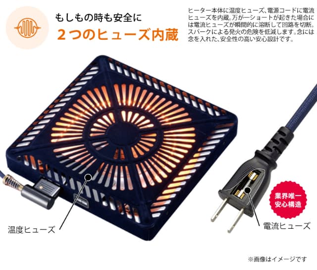 - 二重の安心構造。本体に温度ヒューズ、コードに電流ヒューズ内蔵。