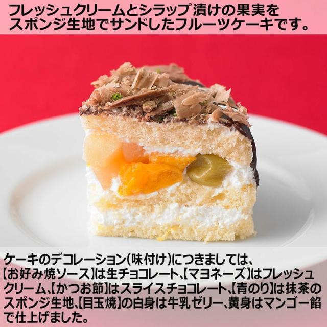 ケーキのデコレーション(味付け)につきましては、【お好み焼ソース】は生チョコレート、【マヨネーズ】はフレッシュクリーム、【かつお節】はスライスチョコレート、【青のり】は抹茶のスポンジ生地、【目玉焼】の白身は牛乳ゼリー、黄身はマンゴー餡で仕上げました。
