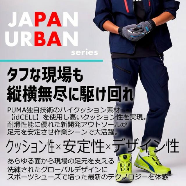 | 説明 特徴 | アスリートブランドPUMAの機能・デザインを兼ね備えたセーフティーシューズ。 高いクッション性と耐滑性能を搭載した【JAPAN URBAN】シリーズ。 ダイヤル式シューレース【DISCレーシングシステム】を搭載したモデル。 プーマ独自のクッション材の【idCELL】を搭載し抜群のクッション性を実現。 耐滑ソールも搭載し様々な作業シーンでも足元がしっかり安定し作業に集中できます。 アッパーはメッシュ素材を使用し通気性にも優れています。 アスリートマインドを詰め込んだセーフティーシューズをぜひお試しください。 【特徴】 ● DISCレーシングディスク搭載モデル ● 耐滑ソール ● 樹脂先芯 ● クッション性に優れ足に優しい ● 足首を保護するミッドカット |