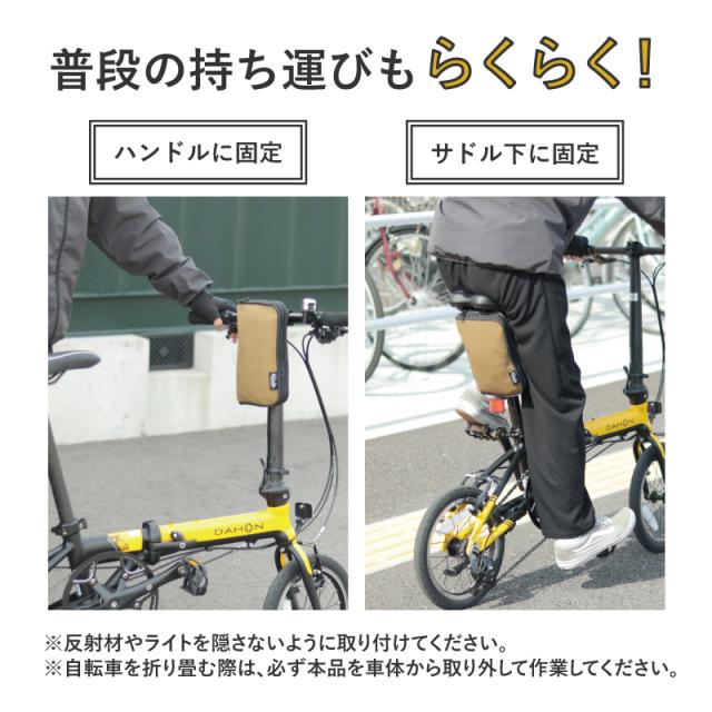 ・輪行袋を使わない時はサドル下やハンドルに固定して持ち運びできる