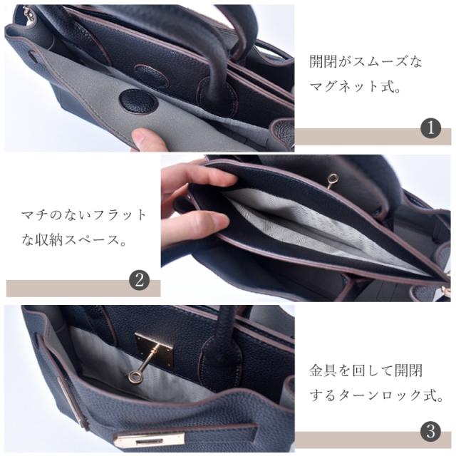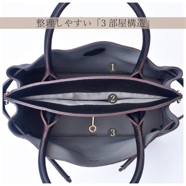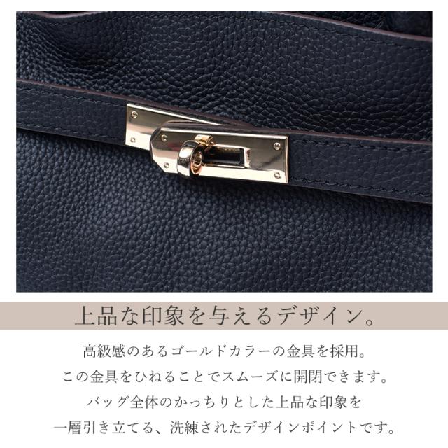 3部屋収納で整理整頓を叶える、大人の本革バッグが新登場♪ ■素材へのこだわり。牛革の魅力。 外側には、きめ細かく美しいシボが特徴の牛革を採用。 傷が目立ちにくく、大人の女性にふさわしい高級感を演出します。 使うほどに手に馴染み、風合いが増していく本革ならではの経年変化もお楽しみいただけます。 ■上品な印象を与えるデザイン。 高級感のあるゴールドカラーの金具を採用。 この金具をひねることでスムーズに開閉できます。 バッグ全体のかっちりとした上品な印象を一層引き立てる、洗練されたデザインポイントです。 ■整理しやすい「3部屋構造」 【メイン収納1:マグネット開閉】 開閉がスムーズなマグネット式。 500mlペットボトルや長財布もすっぽり収まるゆとりのあるスペースで、すぐに取り出したい荷物の収納に便利です。 【中央収納:フリー開閉】 マチのないフラットな収納スペース。 薄い書類やチケット、マスクなど、細かな物や薄い物の整理に最適です。 【メイン収納2:ターンロック開閉】 2本のベルトの間に通して、金具を回して開閉するターンロック式。 クラシカルで高級感のあるデザインです。 こちらも長財布や500mlペットボトルが収納可能です。 ■付属のショルダーベルト。 取り外し可能なショルダーベルトでハンドバッグ、肩掛け、斜め掛けと、シーンや装いに合わせたスタイルを お楽しみいただけます。 ベルトは7段階で長さ調節が可能。 細かく調節できるため、常にバランスの良い位置で快適にお持ちいただけます。 ■擦れや汚れを防止する底あて。 底面には擦れや汚れを防止するため、革が張られています。 これにより、バッグの底が直接地面に触れるのを防ぎます。 底の強度を高めることで、バッグの形が崩れにくいというメリットもあり、長く美しくお使いいただけます。 【“革の表情”について、ご購入前にご確認下さい。】 本製品は蛇本革を使用しておりますので、キズやシワなども入っている場合がございます。 これらは本革ならではの個体差によるものと、2つとない表情を魅せる革の個性であるため、風合いをお楽しみ頂けると幸いでございます。 ※ひどく目立つものは除いて、ある程度は革の個性としてそのまま出荷・発送致します※ ※上記のような革の個性による返品・交換は原則お受け致しかねますので、予めご了承下さいませ※ 【上記のような症状は使用する程に、徐々に革が馴染み目立ちにくくなっていきます。】 |