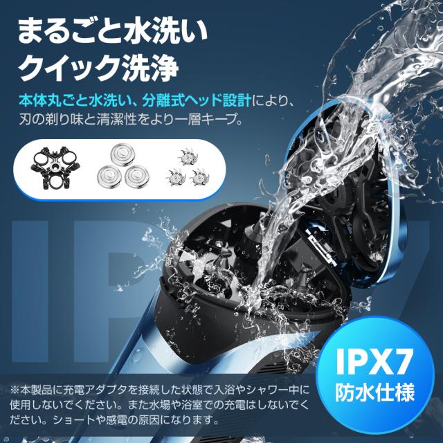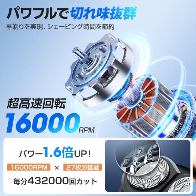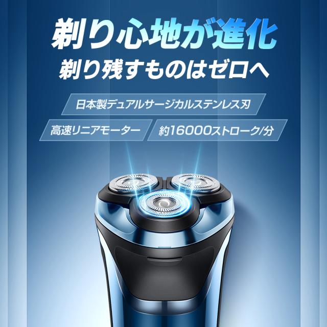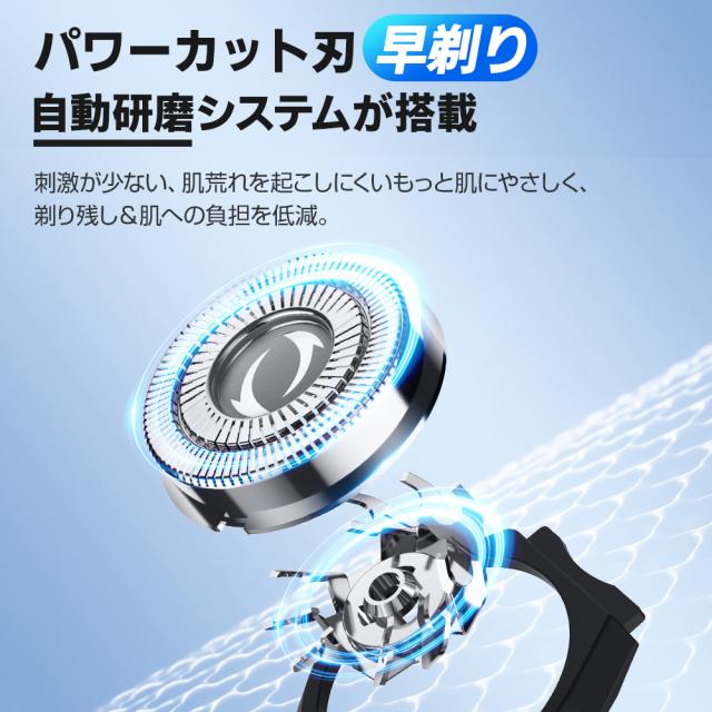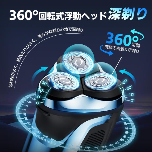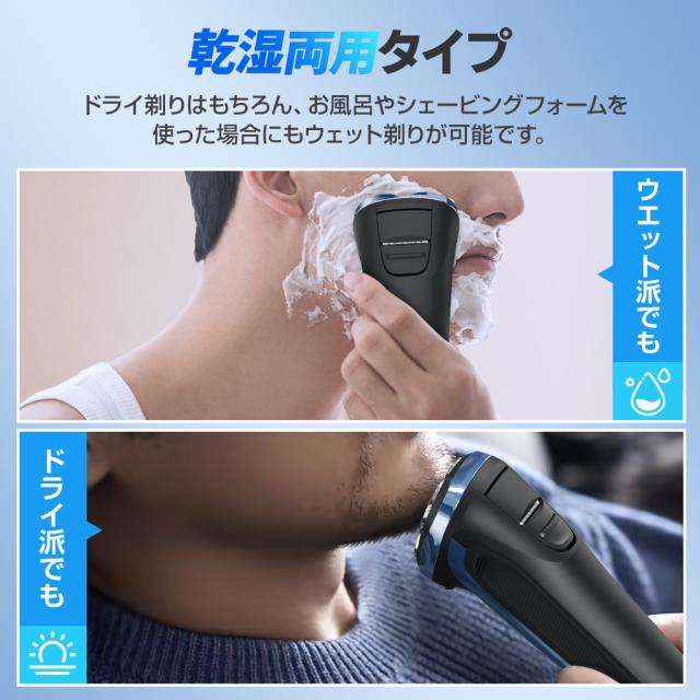 この 電動シェーバー は「剃り心地」を追求。27枚刃&360°回転ヘッドにより深剃り、早剃りが実現。回転刃は、あらゆる角度からヒゲをカット。高速回転で毎秒2,200本以上のヒゲを剃り落とし、剃り残しを軽減。自動研磨式の27枚刃と3つのブレードが立体的に肌を包み込み、滑らかな剃り心地へ。どのような髭状態でも、 メンズシェーバー で美しく剃る。 回転 電動シェーバー は髭をしっかりキャッチ、根元から剃り、柔らかい髭からカールした髭まで、「乾湿両用」で一度にケア。シャワー後の肌にも優しく密着し、剃り残しの心配はありません。「深剃り」を目指す方には、最適な 男性用 電気シェーバー です。