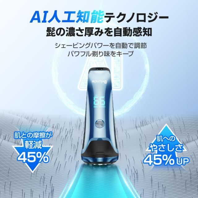 電動髭剃りは、「AIヒゲセンサー」を搭載し、髭の濃さを読み取ってパワーコントロールします。肌への負担を最小限に抑えながら、丁寧に深剃りを実現。敏感肌に対しても優しい仕上がりで、往復式シェーバーの上位モデルと比較しても深剃りが容易です。360度動くヘッド部分は肌にぴったりとフィットし、髭の根元から確実に深剃りでき、剃り残しがゼロで滑らかな仕上がりを実現できる 髭剃り 電動。肌への密着性と剃り心地に特化したこの ひげそり は、肌との摩擦を軽減し、肌への優しさを一層向上させます。 毎日の ひげ剃り を一新するこの 電動髭剃り で、シェービングを快適にしましょう。