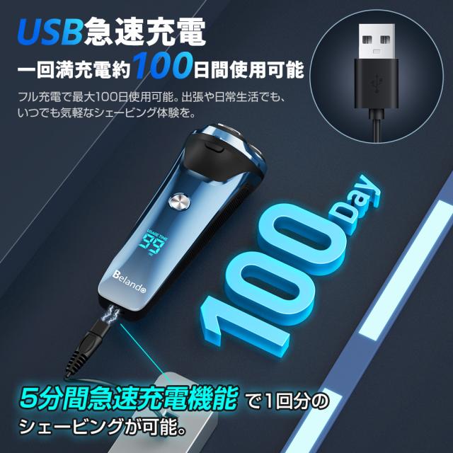 USB充電式 電動シェーバー は急速充電に対応しており、5分間の充電で一回のシェービングが可能です。充電が切れてしまったときでも、すぐに充電して使用可能。パソコンやモバイルバッテリーからでも可能なため、外出先や出張時でも容易に充電でき、常に最適な剃りへ。