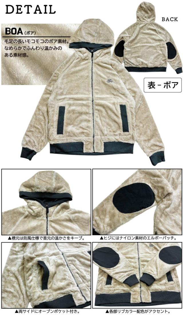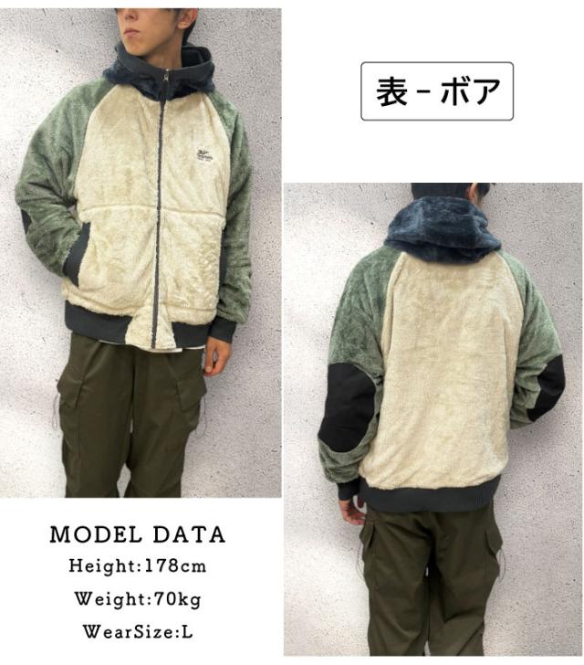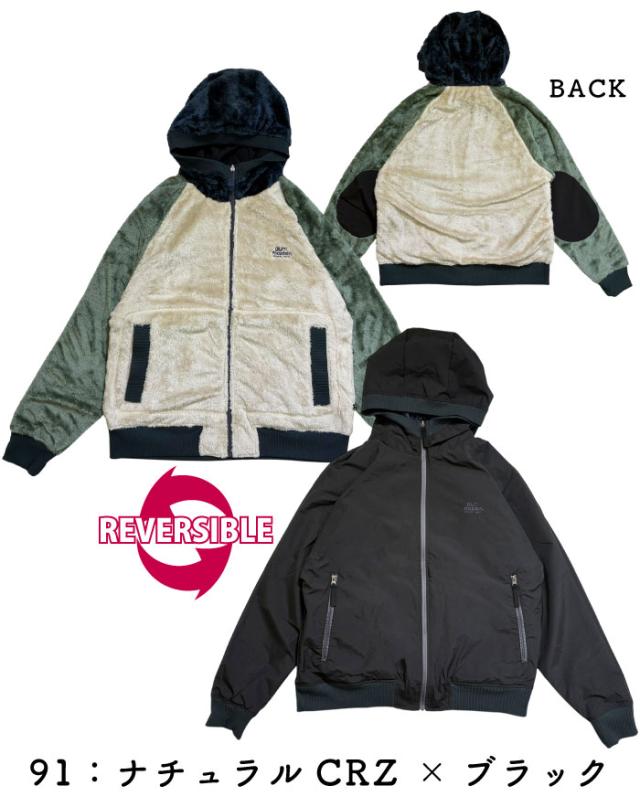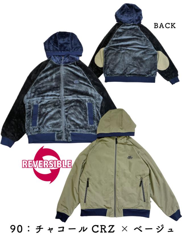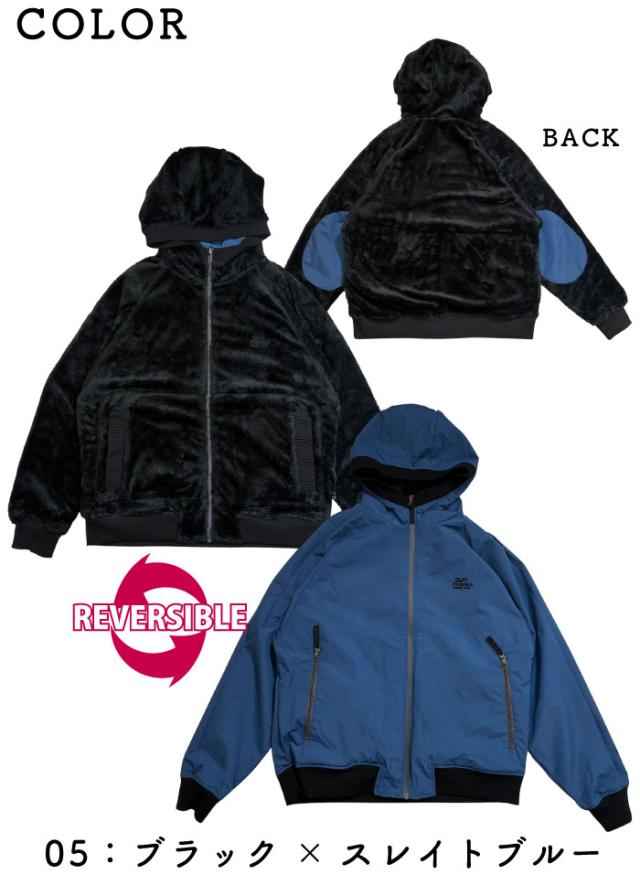 表は毛足の長いふわふわのボア素材、裏は丈夫なリップストップナイロン素材のリバーシブルジャケット。