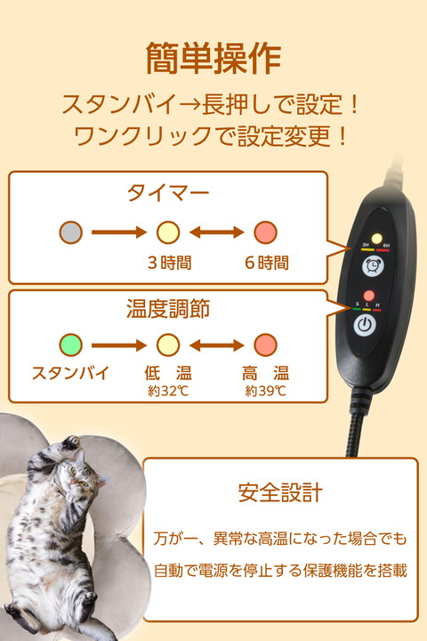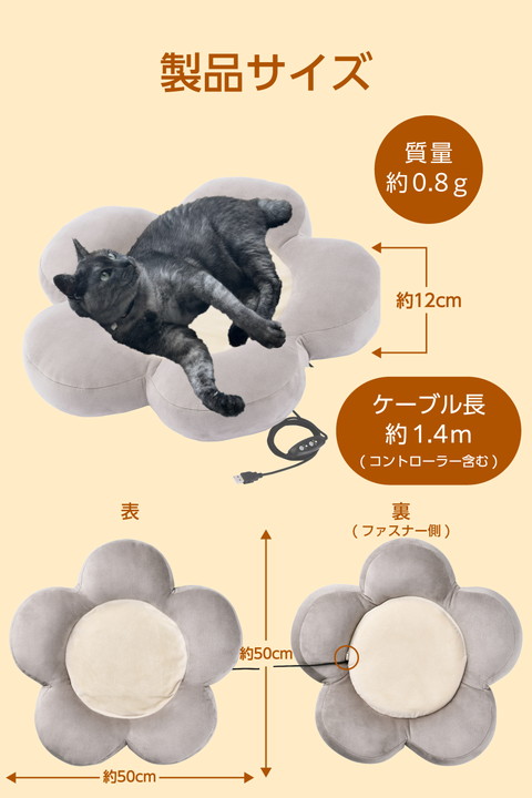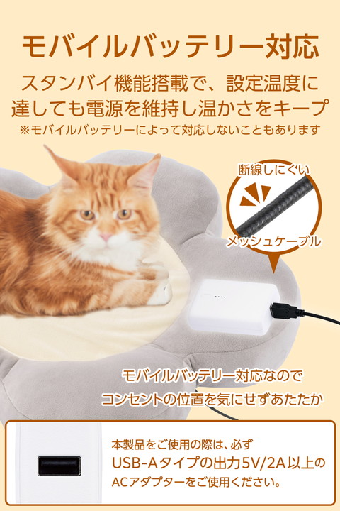冬の暮らしを温かく快適に。柔らかな肌触りとふっくらした花びらのデザインで愛犬や愛猫がリラックスできる、USB給電式のヒーティングクッションです。モバイルバッテリー対応でコンセントがない場所でも使えます。外カバー・中クッションともに手洗いできるので、清潔を保ちながら繰り返し使えます。![]() ■柔らかな肌触りとふっくらした花びらのデザインで愛犬や愛猫がリラックスできる、USB給電式のヒーティングクッションです。 ■モバイルバッテリー対応なので、室内はもちろん、外出先にも持ち運んで使えます。コンセントがない場所やお出かけする際にも活躍します。 ■独自のスタンバイ機能により、設定温度に達してもモバイルバッテリーの電源が切れず、温かさをしっかりキープ。一般的なヒーターのように途中で電源が落ちる心配がないので、愛犬や愛猫の温かい寝床を安心して保てます。 ■※スタンバイモード時におけるモバイルバッテリーとの接続持続は、全てのモバイルバッテリーに対応することを保証するものではありません。 ■噛みつきによる断線が起きにくいメッシュタイプのUSB給電ケーブルを採用しているので、いたずらしても安心です。 ■ヒーターシートに取り付けられたコントローラーで、2段階の温度調節やタイマー設定を簡単に操作できます。 ■温度は外気やペットの状態に合わせて、低温は約32℃、高温は約39℃の2段階で調節でき、冬の暮らしやお出かけを快適にサポートします。 ■3時間と6時間のタイマー設定が可能なので、使い過ぎを防ぎつつ安心して使えて、消し忘れる心配もありません。 ■万が一、異常な高温になった場合でも、自動で電源を停止する保護機能を搭載した安全設計です。 ■外カバー・中クッションともに手洗いできるので、においや汚れを放置せず清潔に使用できます。洗濯ネットを使用すれば洗濯機での脱水も可能です。 ■※洗う際はコントローラー付きヒーターシートを必ず取り出してください。 ■花びら部分をふっくらと盛り上げたデザインなので、頭や手足が置きやすく、ゆったりくつろげるリラックス形状です。 ■柔らかな肌触りで、ペットの毛が絡まりにくい生地を採用。傷も付きにくいので、寝床を掘る子でも破れにくいです。 ■ヒーター部分を撥水生地で覆っているため、うっかり水がこぼれてしまった場合やペットが濡れたまま乗っても安心です。 ■自社環境認定基準を1つ以上満たし、『THINK ECOLOGY』マークを表示した製品です。 ■環境保全に取り組み、製品の包装容器が紙・ダンボール・ポリ袋のみで構成されている製品です。 ![]() ■定格電圧:DC5V(USB給電入力) ■消費電力:7.5W(最大) ■コネクター形状:USB-Aプラグ ■温度調節機能:待機モード、弱モード:約32℃、強モード:約39℃ ■タイマー:3時間モード、6時間モード ■セット内容:本体カバー×1、コントローラー付きヒーターシート×1(取り外し可能) ■材質:表生地:ポリエステル95%+ポリウレタン5%、中綿:ポリエステル100% ■サイズ:幅約500mm×奥行約500mm(中央フラット部 約φ300mm)×高さ約120mm ■質量:約0.8kg ■カラー:グレー ■ケーブル長:約1.4m(コントローラー含む) ■使用温度・湿度:約0℃〜40℃・約10%〜85%(結露なきこと) ■保管温度・湿度:約-10℃〜60℃・約10%〜85%(結露なきこと) ■保証期間:1年間 |
