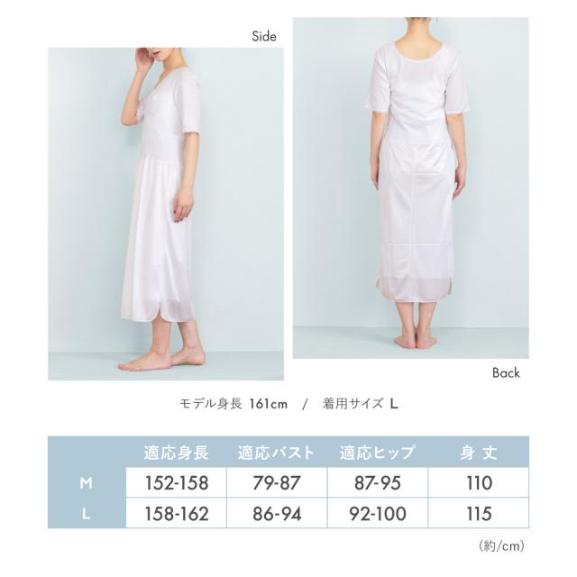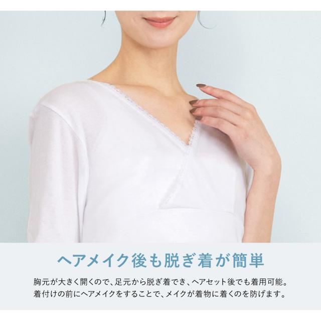 深い襟ぐりで、アップにした髪を崩さずに足からの着脱も可能です。