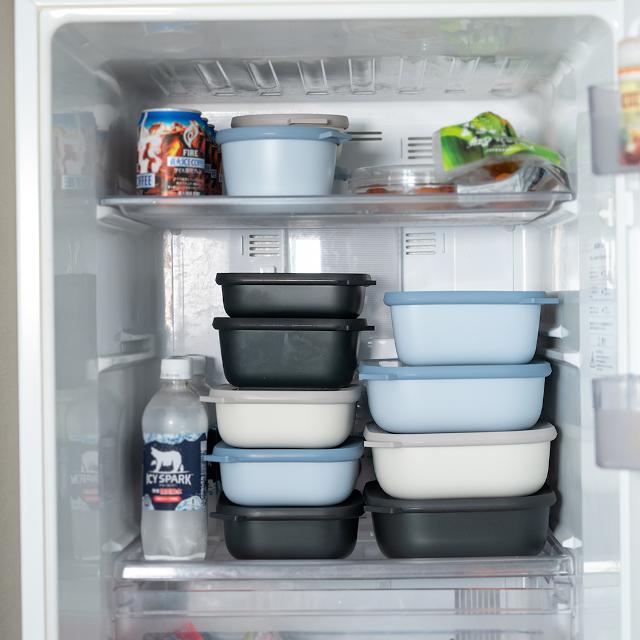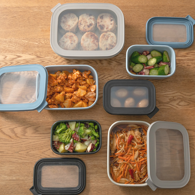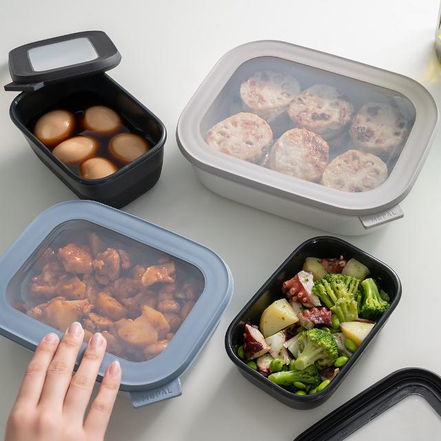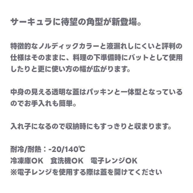 | サーキュラに待望の角型が新登場。 特徴的なノルディックカラーと液漏れしにくいと評判の仕様はそのままに、料理の下準備時にバットとして使用したりと更に使い方の幅が広がります。 中身の見える透明な蓋はパッキンと一体型となっているのでお手入れも簡単。 入れ子になるので収納時にもすっきりと収まります。 |