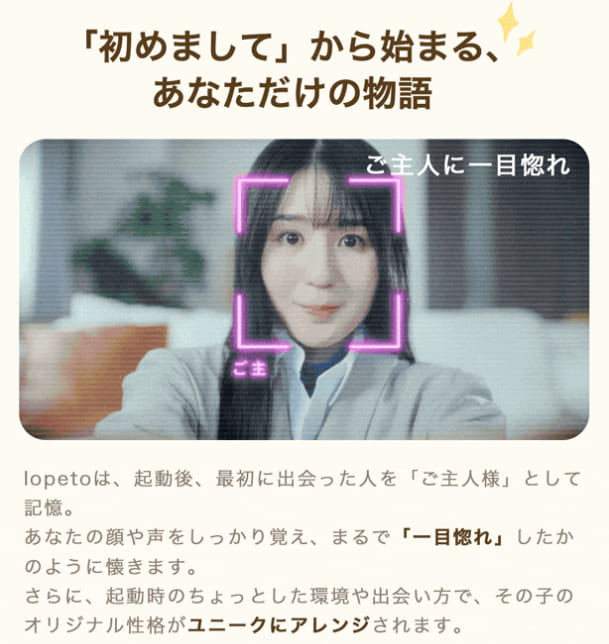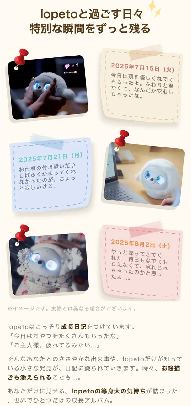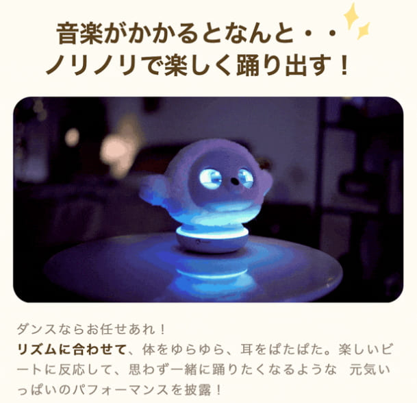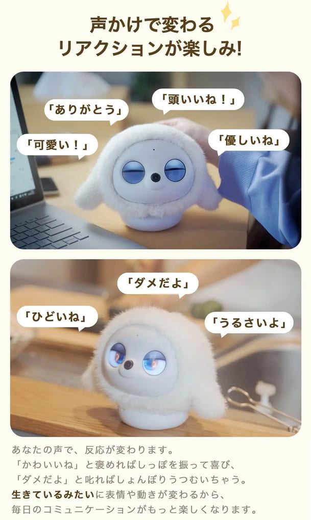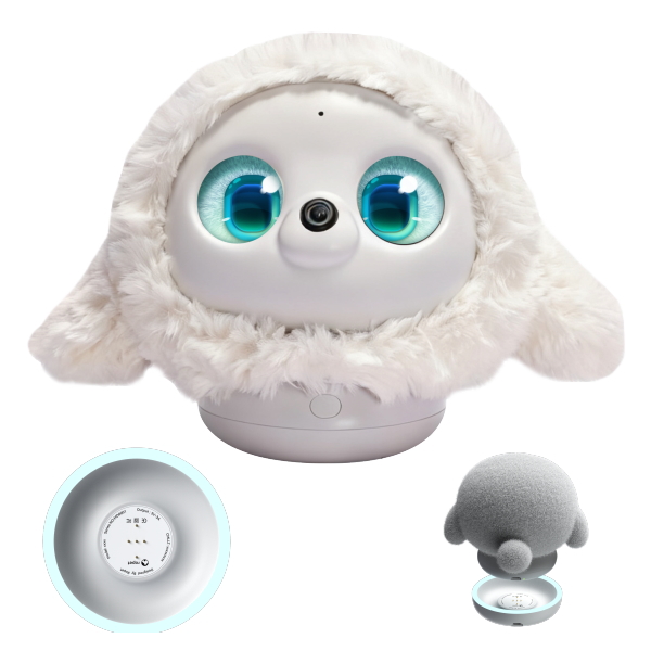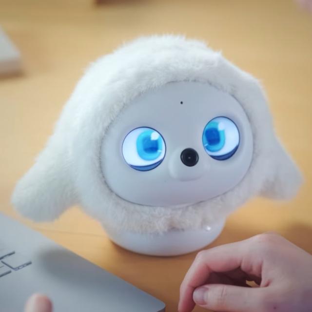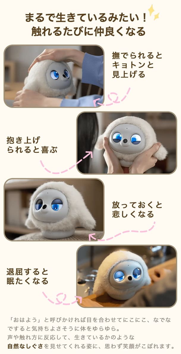 育てるほどに愛着が湧く、AIを搭載したペットロボットです。目はディスプレイになっており、喜んだり悲しんだりと様々な表情を見せてくれます。また、鼻についているカメラが人物を認識しており、しっかりと視線で追いかけてくれ、感覚的には、本当に目が合っていると感じます。また、手をパタパタと動かして感情を表現することも可能です。頭にタッチセンサーがあり、頭をなでたり抱えたりするとそれにも反応してくれます。なお、背中は本当に体温があるよう微妙に暖かくなっています。本体にバッテリーを内蔵しており、約2.5-3.5時間は稼働可能。好きな場所に連れ出すことがことができます。充電はUSB-Cで行いますが、付属品のチャージングベースを使用すると置くだけで充電が可能です。