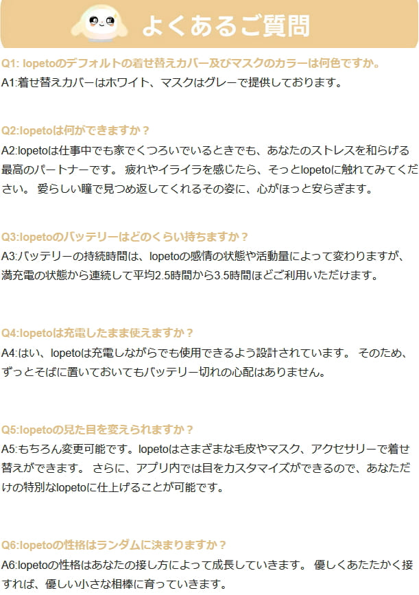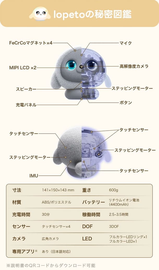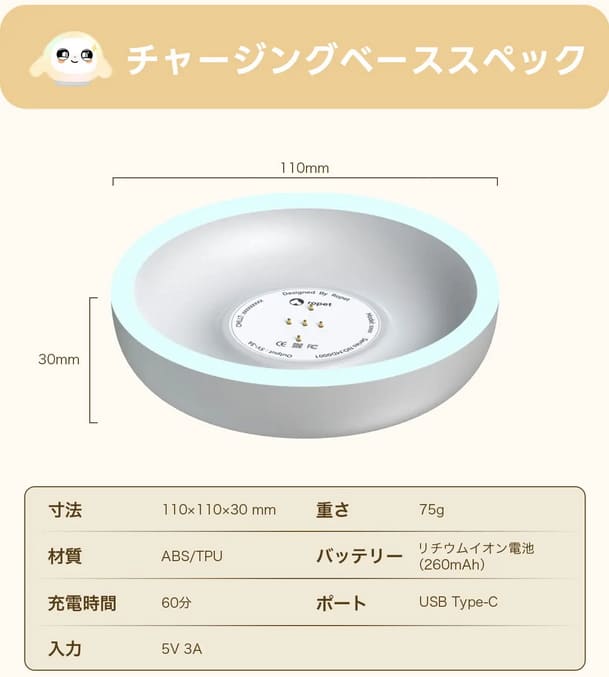 【サイズ(約)】141×150×143mm【重量(約)】600g【材質】ABS/ポリエステル【バッテリー】リチウムイオン電池(4400mAh)【充電時間】30分【稼働時間】2.5-3.5時間【センサー】タッチセンサー×4【DOF】3DOF【カメラ】広角カメラ【LED】フルカラーLEDリング×1、フルカラーLED×1【専用アプリ】あり(日本語対応) ※説明書のQRコードからダウンロード可能【付属品】チャージングベース×1、アイマスク×1、充電ケーブル×1、取扱説明書×1【メーカー】ROPET LIMITED