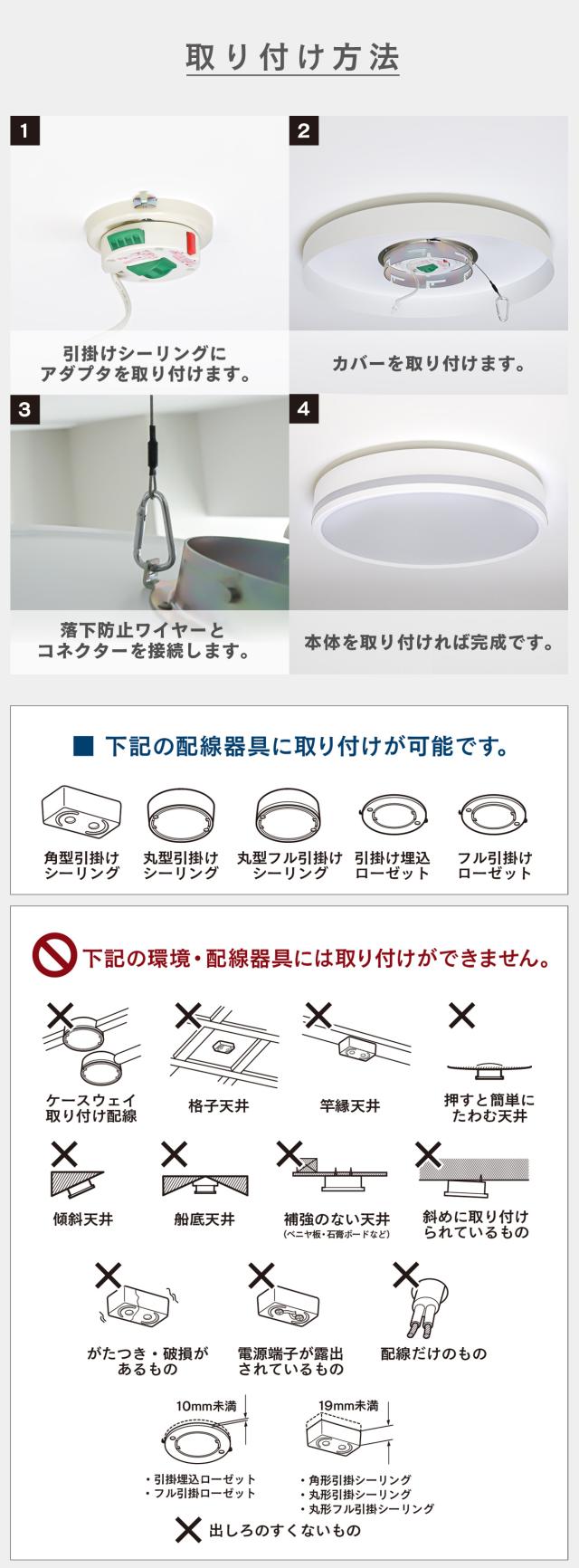 | 備考 | ※壁スイッチなどからのオンオフ操作も可能ではありますが、デバイスがリセット状態に戻る(点滅状態になる)ことがございますので、壁スイッチでの操作はなるべくお控えください。 ※この製品・アプリは日本国内専用です。海外ではご使用になれません。 ※交流100V、周波数50/60Hz以外での電源では使用しないでください。 ※引掛けシーリング用です。 ※調光器スイッチには使用しないでください。 ※LEDですが点灯中や消灯直後は器具が高温になります。触らないようにご注意ください。 ※製品の設置に関わる工事費、点灯の不具合に伴い発生する費用、二次的損害(設置納期遅延、施工費、人件費、業務に支障が生じた際の損失等)など一切の責任を負いかねますので予めご了承ください。 その他取扱説明書をよくお読みの上ご使用ください。 |