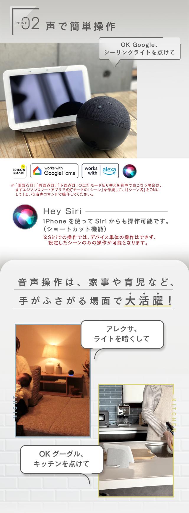 また、Amazon Alexa・Google Home・Siriと連携して音声操作も可能。