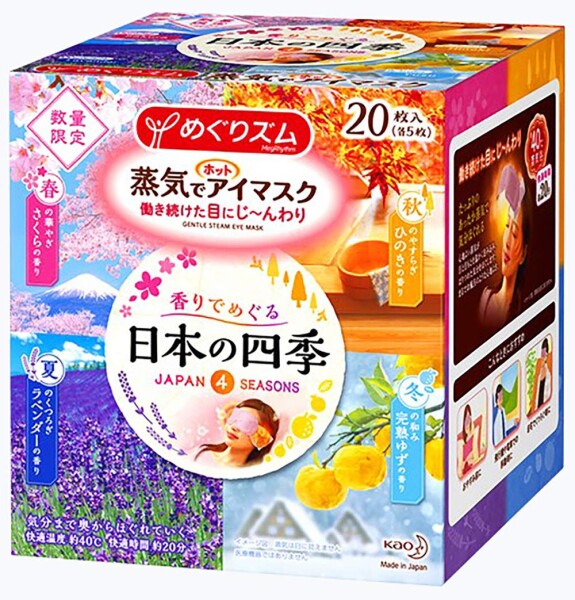 | 商品名 | めぐりズム 蒸気でホットアイマスク 香りでめぐる日本の四季 (さくら・ラベンダー・ひのき・完熟ゆず 各5枚) 計20枚入 |