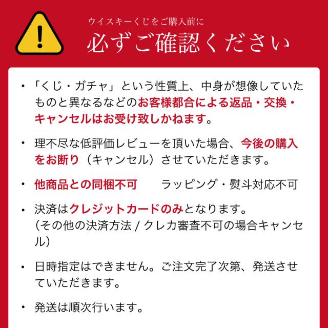 ※※※※※ご購入前に必ずご確認ください※※※※※ ■こちらの商品はお一人様4口までとなっております。 ■「くじ・ガチャ」という性質上、中身が想像していたものと異なるなどのお客様都合による返品・交換・キャンセルはお受け致しかねます。 ■配送が遅いといった内容や中身に納得できないといった(ハズレでした★3,2,1など)レビューされる方はご購入控えて頂くようお願い致します。 理不尽な低評価レビューを頂いた場合、今後の購入をお断り(キャンセル)する場合がございます。 ■他商品との同梱は致しかねますので、同時購入の際は送料が二重にかかる場合がございます。ご注意ください。 ■ラッピングや熨斗対応は行っておりません。 ■日時指定はできません。ご注文完了次第、発送させていただきます。 ■画像に掲載されているウイスキーのどちらか1本(1口)が発送されます。各お客様へは、どのウイスキーが発送されるか分からないように運用しておりますので、運試しにお楽しみ頂けたら幸いです。 ■当商品ページは、発送日から数日後に次のくじ企画に切り替わります。商品到着後に購入履歴等で確認した場合、次企画の商品ラインナップの内容に切り替わっている場合があります。お客様各自で購入時又はショップ発送日までにお控え下さい。 ■決済はクレジットのみでお願いします。その他は申し訳ございませんがキャンセルさせて頂きます。(クレジットカード審査不可の場合はキャンセル致します) 以上をご確認の上、運試しにお楽しみください。 |