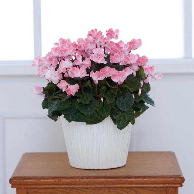 鮮やかなピンク色 小輪で八重咲きのシクラメンです。 花を中心に寄せず、蝶が飛び回っているような姿が可愛いです。
