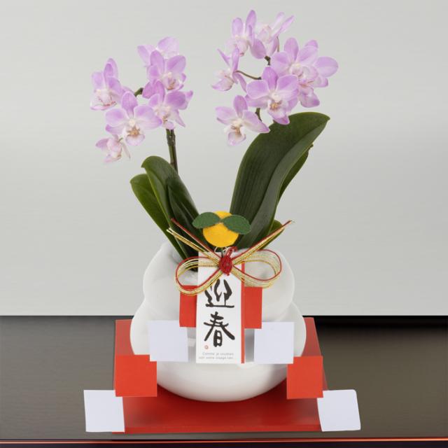 鏡餅をモチーフにした器のミニ胡蝶蘭です。