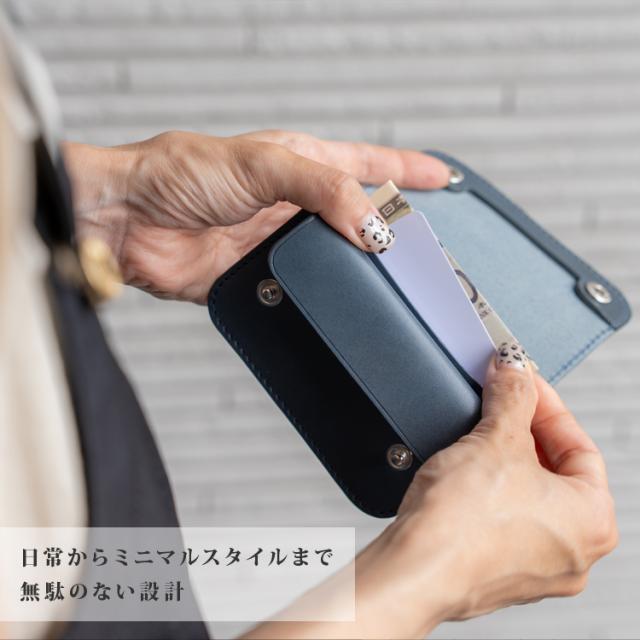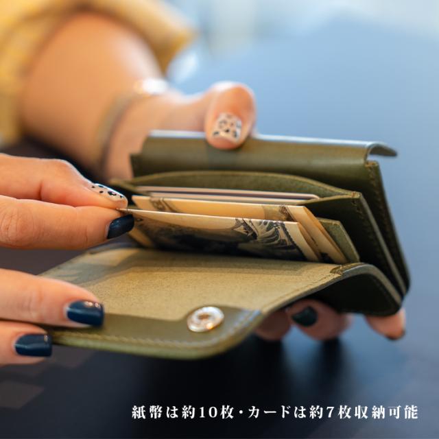 スナップボタン式で開閉しやすく、札入れ・コインケース・カード収納をしっかり備えた実用設計です。