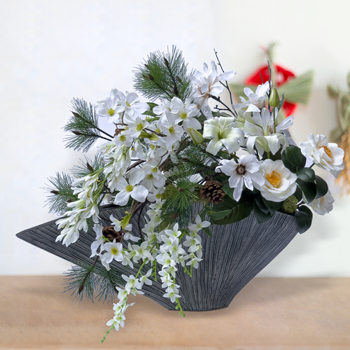 良質なアーティフィシャルフラワーでデザインした華やかな新春花です。