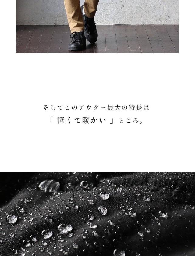 ・撥水・防風性が高いナイロンの中に、フードから裾・袖口までを軽くて暖かい中綿を充填。