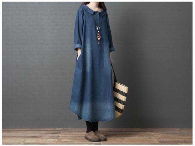 デニム ワンピース 春 秋 長袖 レディース カジュアル デニムワンピース ロング丈 ゆったり 体型カバー 大きいサイズ 可愛い おしゃれ 無地 ケミカルウォッシュ 色落ち
