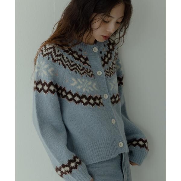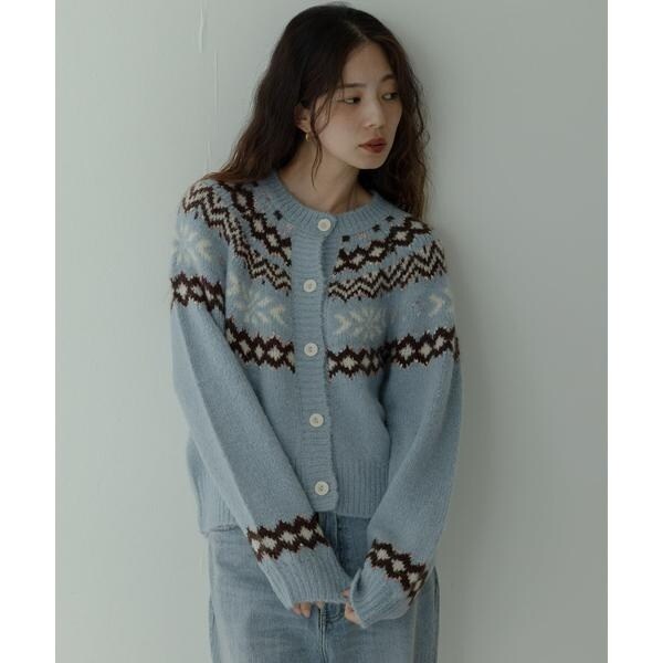 冬らしいモチーフをあしらったオリジナルの柄と配色が着映え力抜群のニットカーディガン。