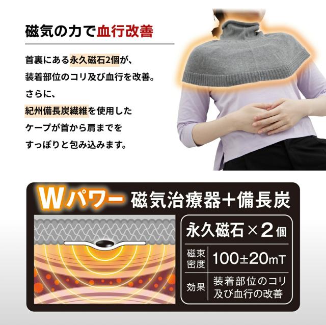 「首や肩のコリがつらい」「冷え性で首元がいつも寒い」そんなお悩みを持つ方におすすめの、磁気の力で首元をほぐす医療機器ウォーマーです。首元には永久磁石が2個内蔵されており、装着部の血行を改善し、首のコリをじんわりと治療します。さらに、紀州備長炭繊維を使用したケープが、冷えやすい首から肩までを優しく包み込み、温めます。