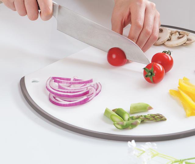 まな板の縁に滑り止めが付いているので、しっかり固定されて安心です。手元が安定しスムーズに食材を切り進められます。