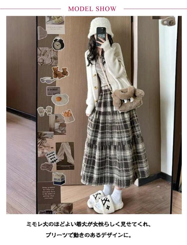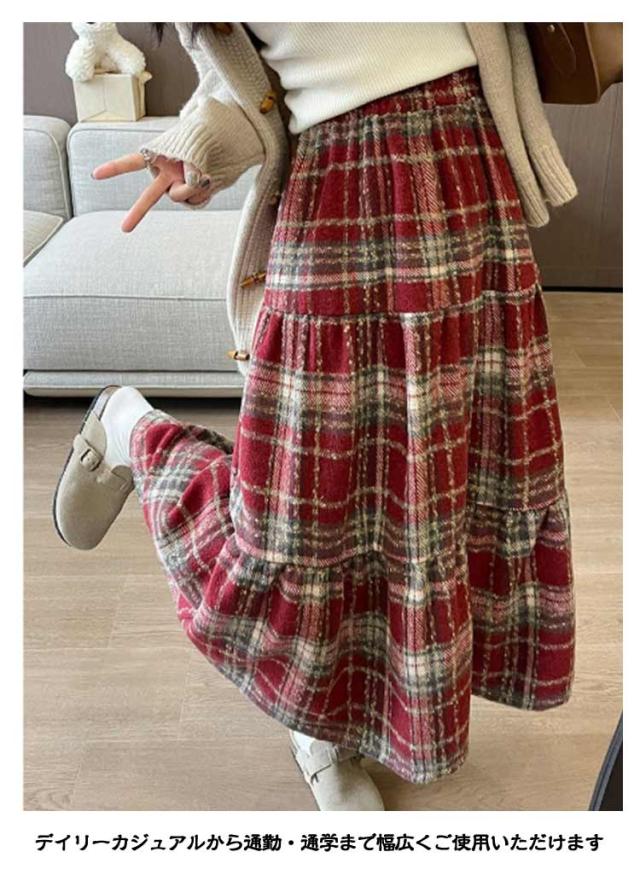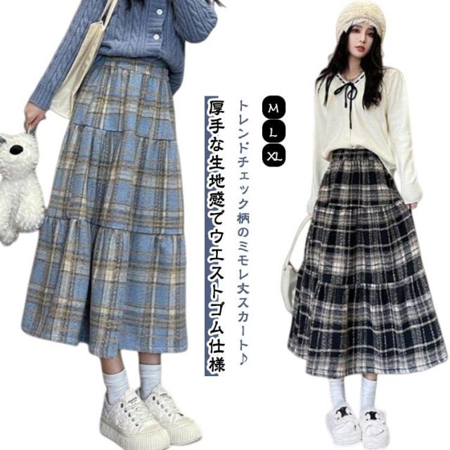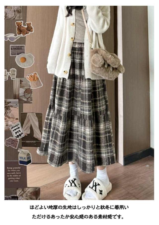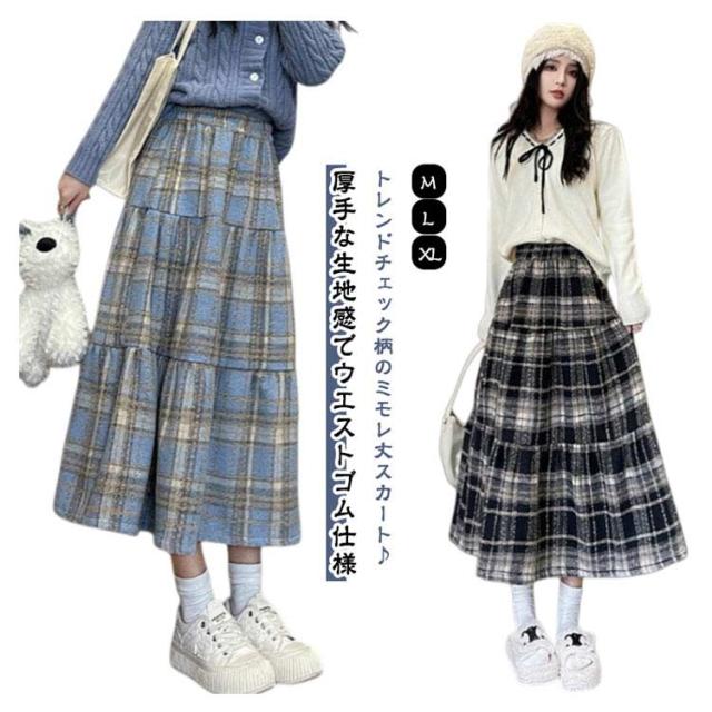 レディース チェック柄 ロング Aライン 秋 スカート ミモレ丈スカート ウール風生地 春 フレアスカート 総柄 ゆったり スカート きれいめ お洒落 着回し デート ロンスカ ウエストゴム チェックスカート ボトムス おしゃれ かわいい お洒落 秋冬 ひざ丈 厚手