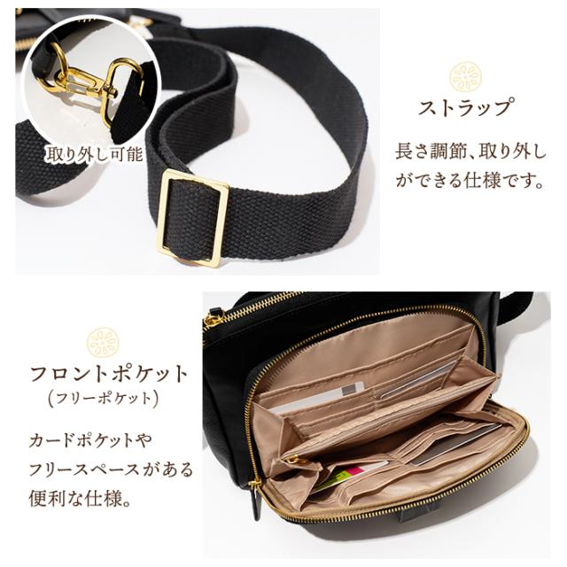 フロントポケット内に、カードポケットや、ファスナーポケットがあるので、 フロントポケットをお財布として使用できる、お財布ショルダータイプ。