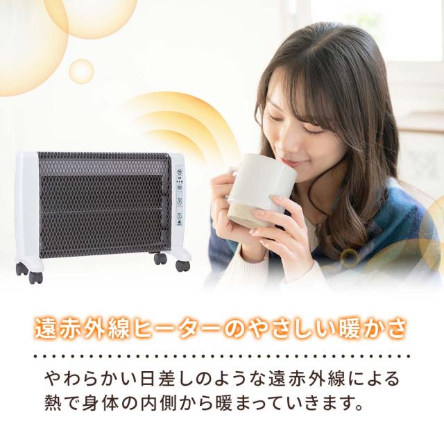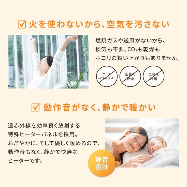 遠赤外線を効率良く放射する特殊ヒーターパネルを採用。おだやかに、そして優しく暖めるので、動作音もなく、静かで快適なヒーターです。