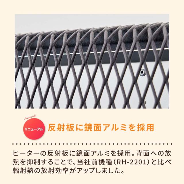 [リニューアルポイント]ヒーターの反射板に鏡面アルミを採用。背面への放熱を抑制することで、当社前機種(RH-2201)と比べ輻射熱の放射効率がアップしました。