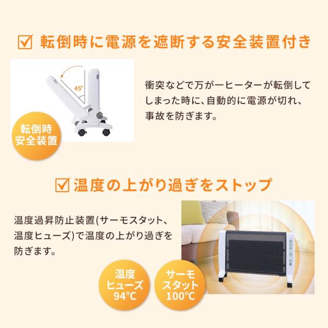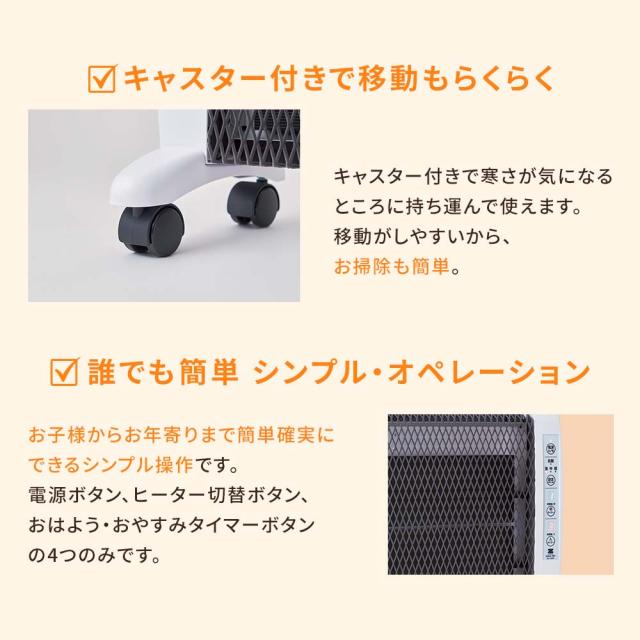 静音・安心設計:特殊ヒーターパネルにより、動作音は静かで快適。転倒時安全装置や温度過昇防止装置など、安心機能も充実しています。