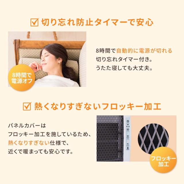 パネルカバーはフロッキー加工を施しているため、熱くなりすぎない仕様で、近くで暖まっても安心です。