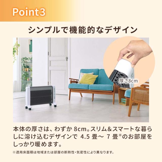 本体の厚さは、わずか8cm。コンパクトなデザインで4.5畳〜7畳※のお部屋をしっかり暖めます。