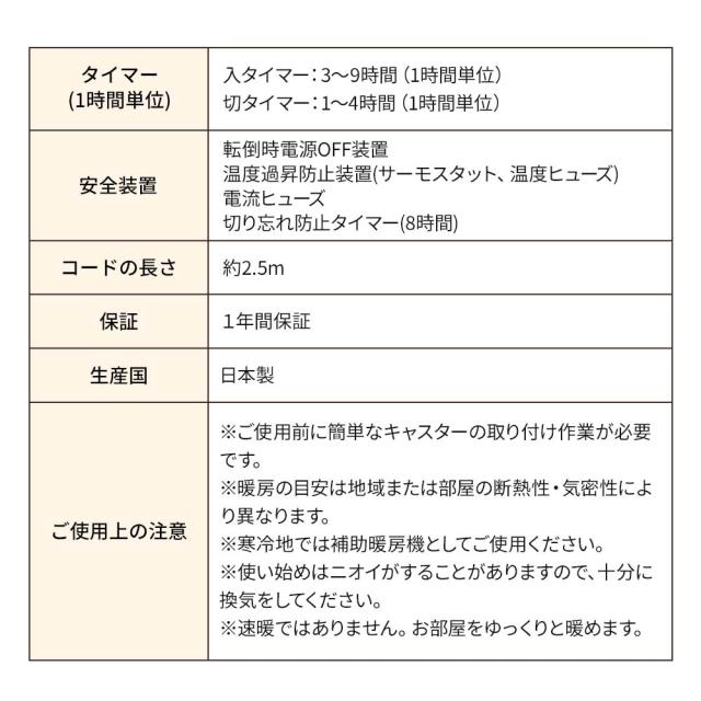 安全装置:転倒時電源OFF装置、温度過昇防止装置(サーモスタット、温度ヒューズ)、電流ヒューズ、切り忘れ防止タイマー(8時間)