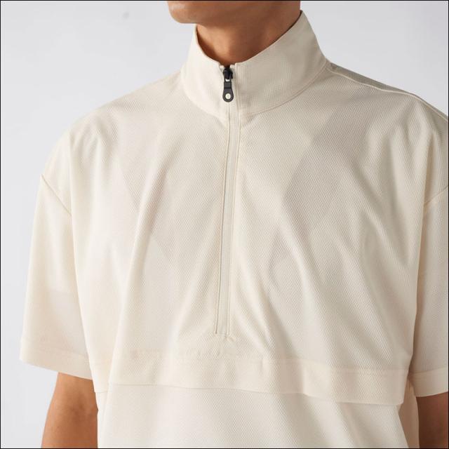 ハーフジップでややゆったりとした半袖プルオーバー。超軽量素材で肌離れが良く、快適な着心地なので暑さが残る晩夏に、ウエストアウトして涼しく着こなせます。リラックスサイズなので、インナーも着やすく、気温に合わせてコーディネートを楽しめます。裾にはドローコード付きで調節可能。