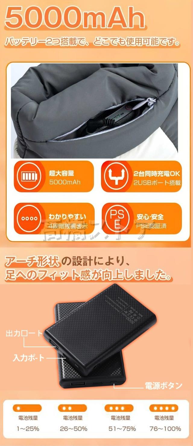カラー ブラック、グレー おすすめサイズ S/22.5-24CM、L/25-26.5CM 定格入力 5V/2A 温度調整 3段階(低・中・高) 電池容量 5000mAh 使用時間 弱:約6.5H 中:約5H 強:約3.5H 充電時間 約2H ★使用条件によって異なる場合があります。 |