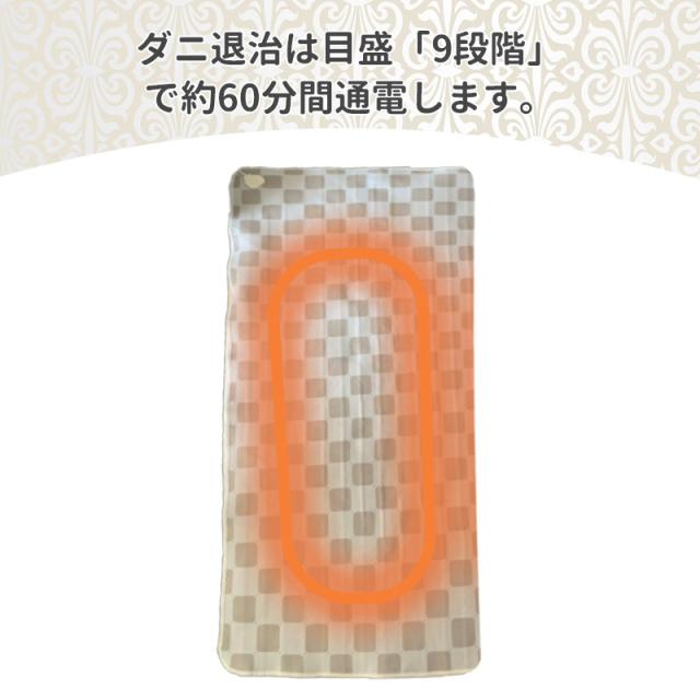 ●ダニ退治機能付き。布団で挟んで「9段階」で3時間通電すると、99.9%のダニが死滅します。
