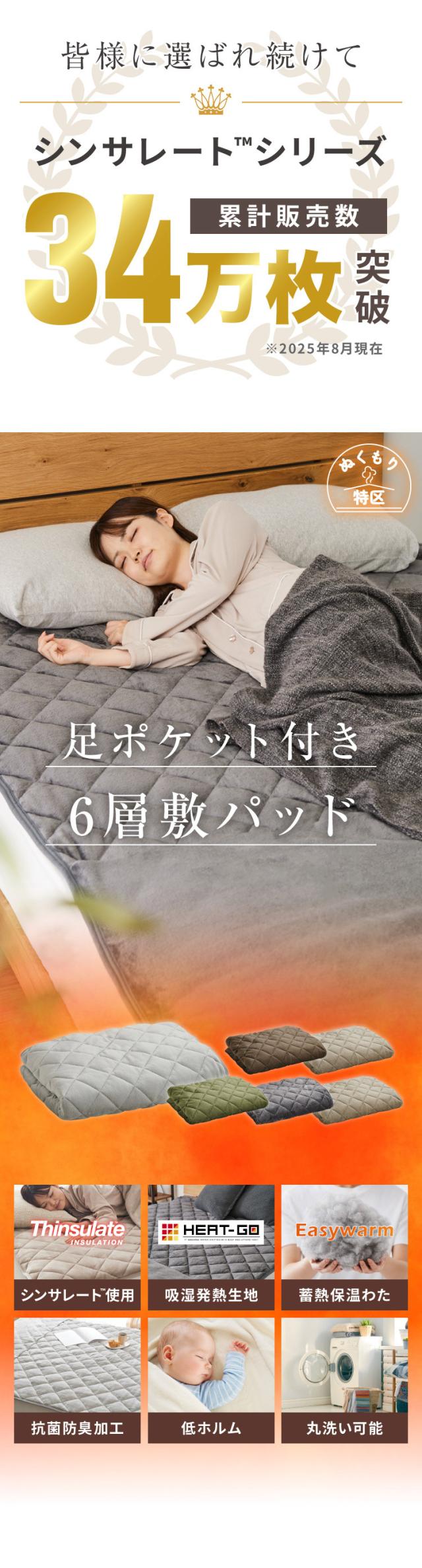 シンサレート綿入り6層プレミアム敷きパッド 足ポケット付き
