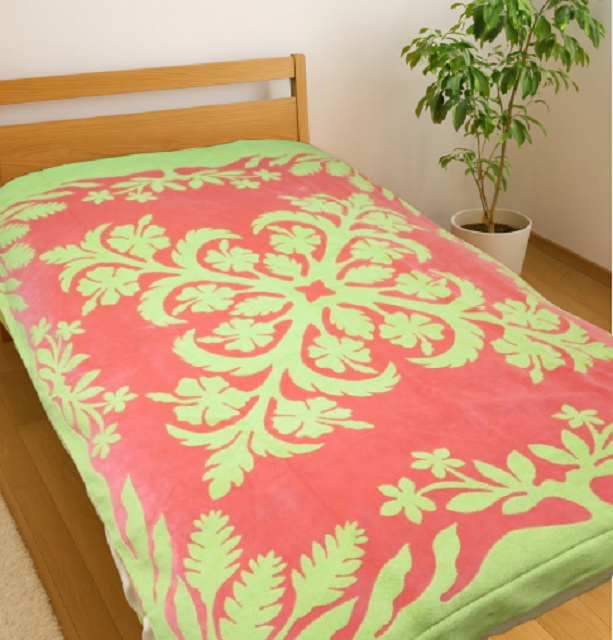 ハワイの大自然や植物たちのキルトモチーフが施されたタオルケット。