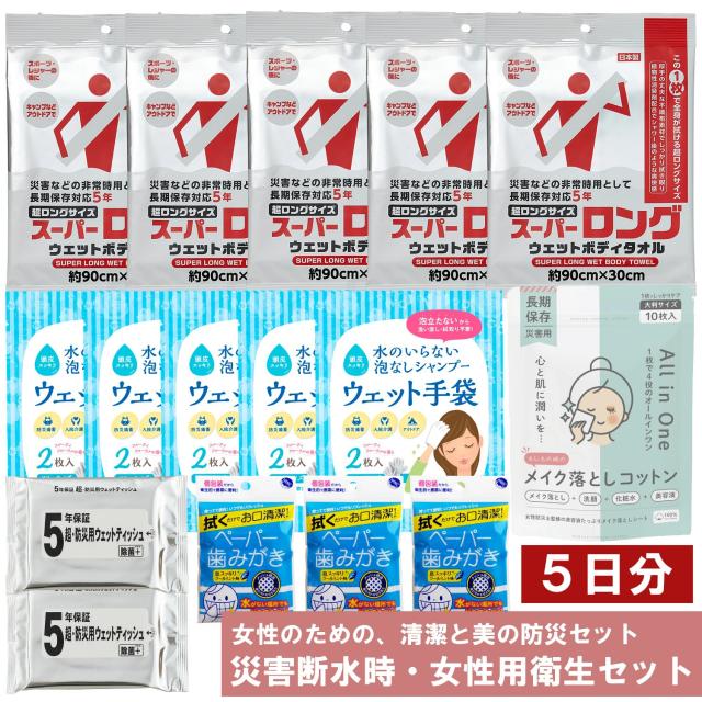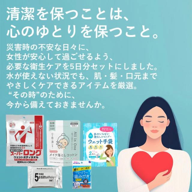 防災セット 女性用 断水・災害時に使える衛生用品5日分 ウェットタオル 歯磨きシート メイク落とし 除菌ウェット シャンプー手袋入りで清潔をキープ 一人暮らしの女性に最適