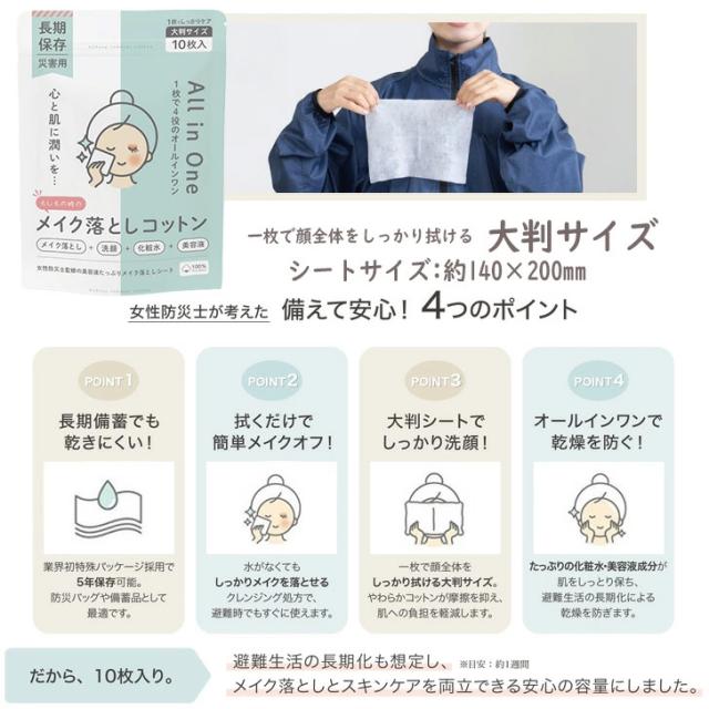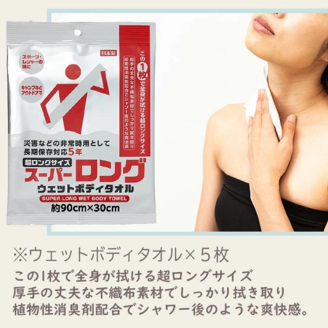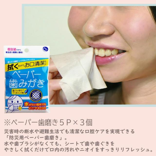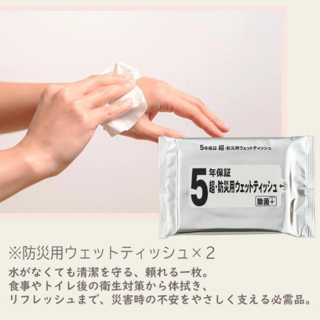 もしもの時のメイク落としコットン(10枚入)×1、スーパーロングウェットボディタオル×5、ウェット手袋(水のいらない泡なしシャンプー手袋)×5、ペーパー歯磨き5P×3、防災ウェットティッシュ(除菌+)×2