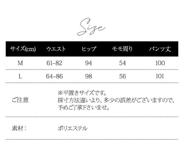 「L」パンツ丈101,ウェスト64-86、ヒップ98、モモ周り56、参考体重55-65kg
