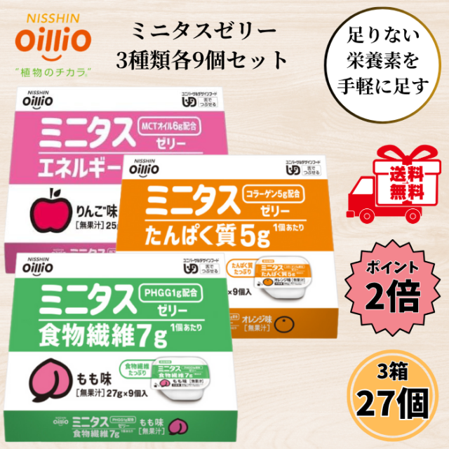 日清オイリオ ミニタス ゼリー 3種類 各1箱 27個セット ミニタスゼリー 介護食 MCT 高カロリー デザート ハイカロリー 高齢者 舌でつぶせる りんご オレンジ もも エネルギー たんぱく質 食物繊維 栄養補給 介護 送料無料