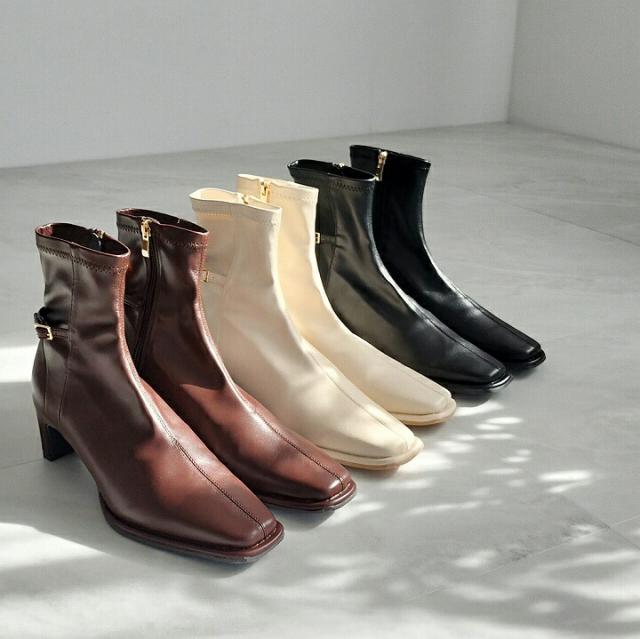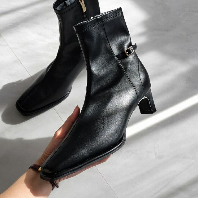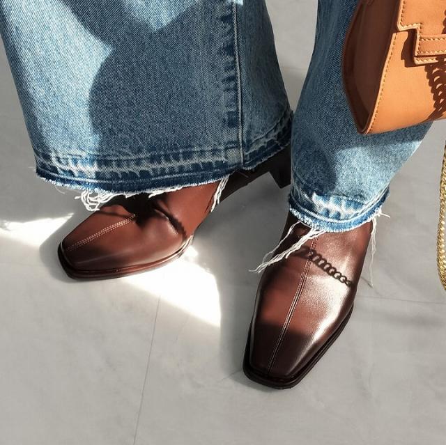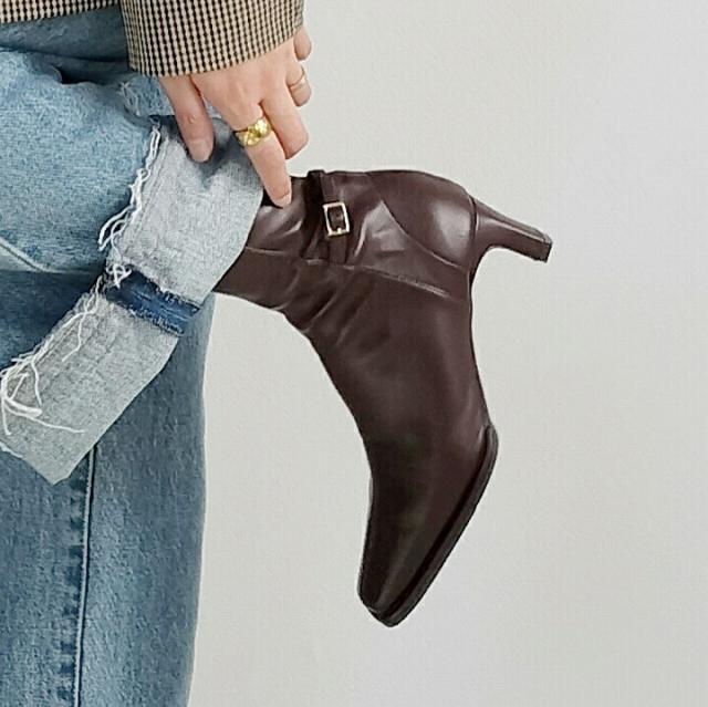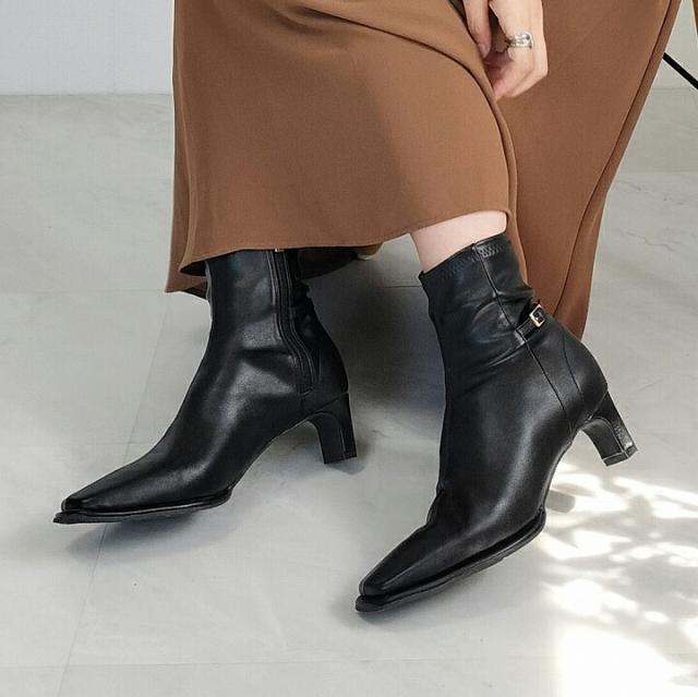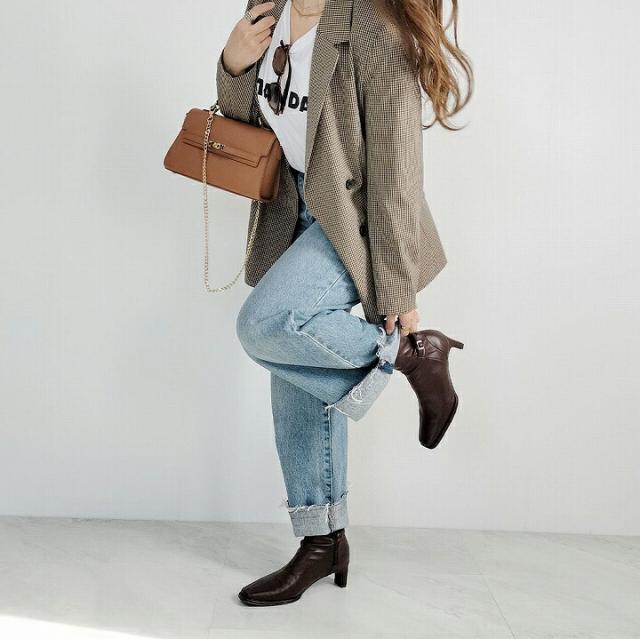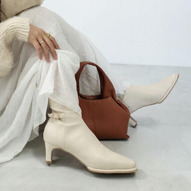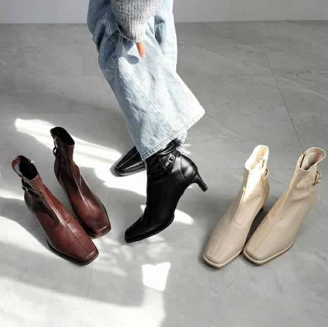 ・細めのスクエアトゥ×プレートヒールで脚をスッキリと見せてシャープさのある大人な美シルエットに。