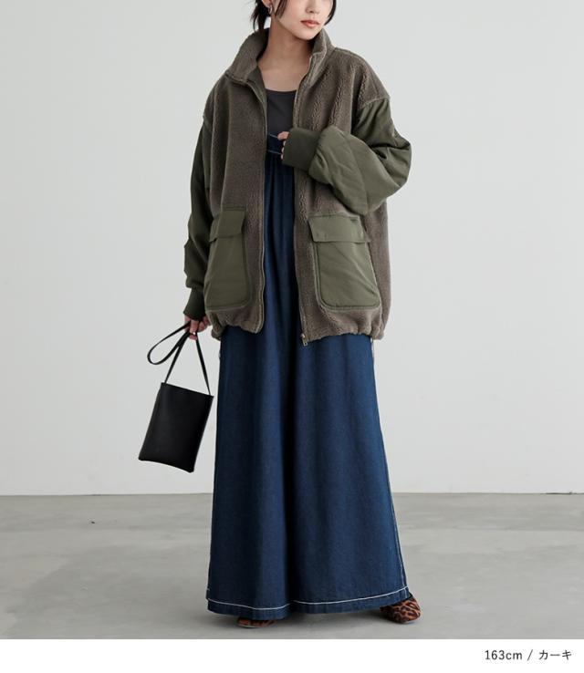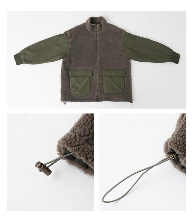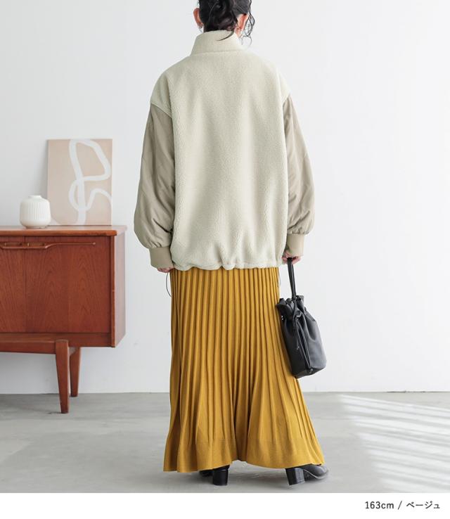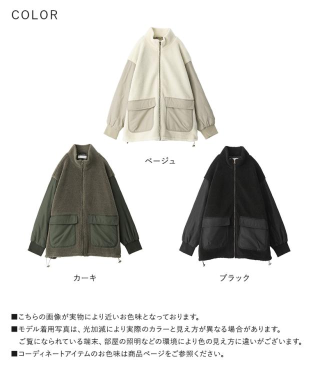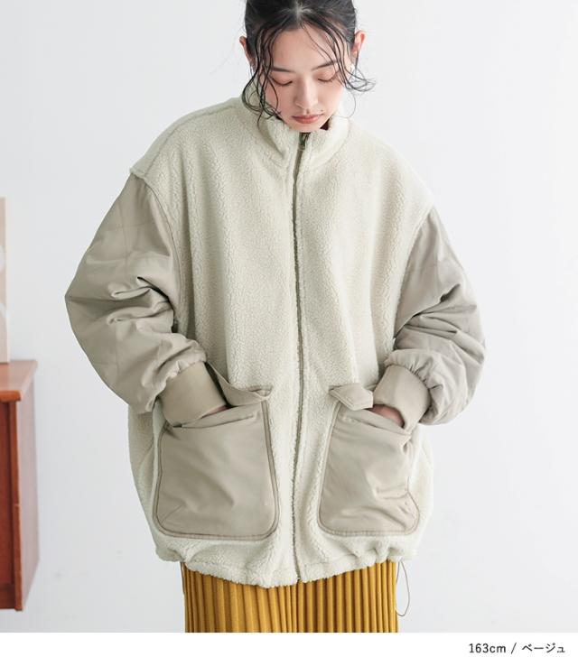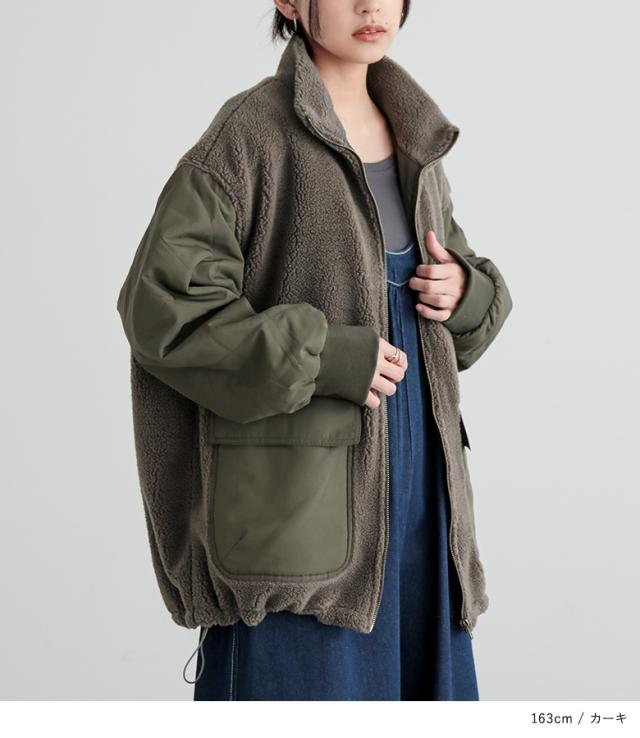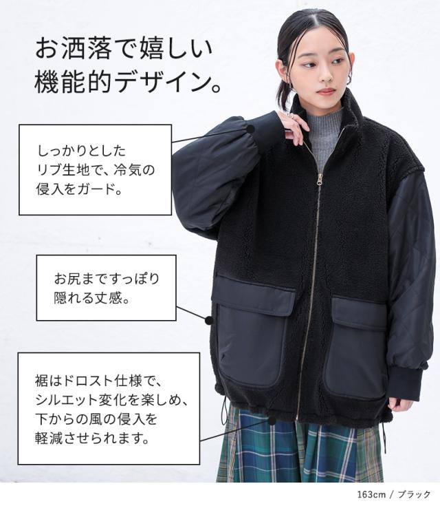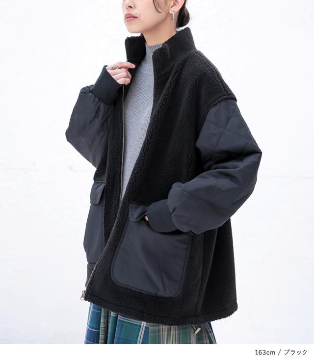 <秋新作>『ボアキルティング切替ブルゾン』【メール便不可】【60】[ブルゾン レディース アウター ジャケット ジップアップ 長袖 ボア キルティング 異素材 スタンドネック ぽわん袖 ドロスト 秋 冬]