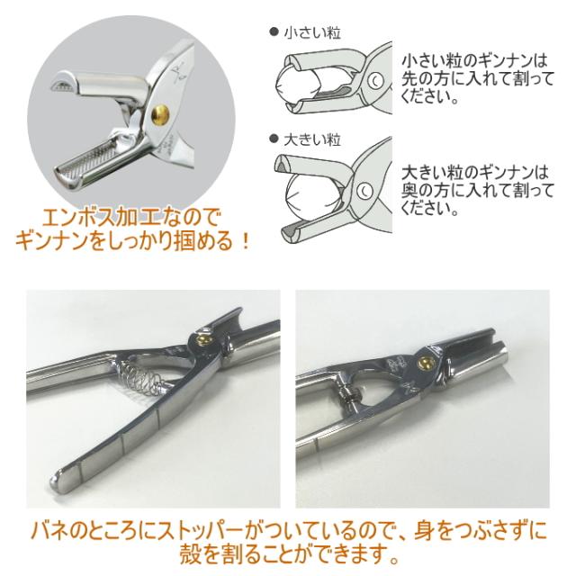 ・ギンナンの殻割り以外に使用すると破損する恐れがありますのでギンナンの殻割り以外には使用しないでください。 ・ギンナンをはさむ際、指をはさまないようご注意ください。ギンナンの節をはさんだことを確認してから柄を握って割ってください。 ・小さいギンナンは割れ難いことがあります。 |