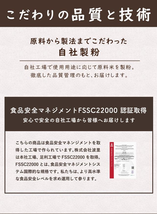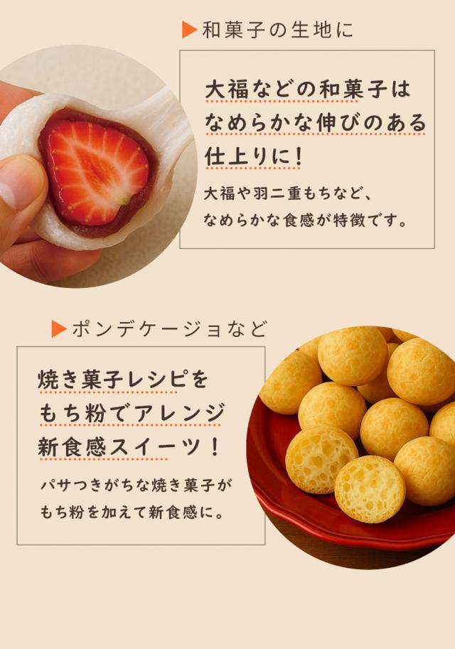 アメリカ産もち米を原料に、こだわりの自社製粉できめ細かいもち粉に仕上げました。大福やお団子などの和菓子はもちろん、小麦粉と同程度のきめ細かい粉ですので、料理からパン作りやお菓子作りなど幅広いメニューにご利用いただけます。